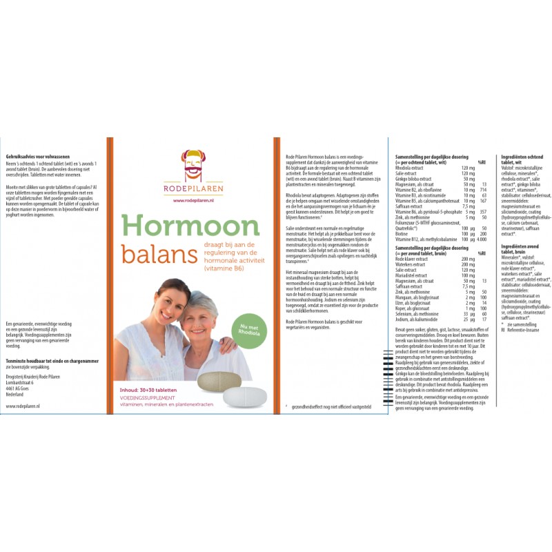 Rode Pilaren Hormoon balans draagt dankzij de aanwezigheid van vitamine B6 bij aan de regulering van de hormonale activiteit. De formule bestaat uit een ochtend tablet (wit) en een avond tablet (bruin). Naast vitamine B6 is een combinatie van plantextracten, vitaminen en mineralen toegevoegd.