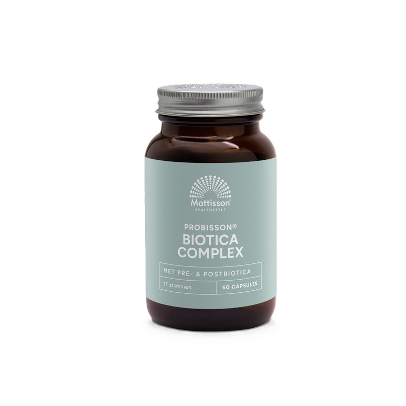 Mattisson biotica complex bestaat uit 17 bacteriestammen van 10 miljard eenheden CFU per capsule in combinatie met het prebioticum Sunfiber® en het postbioticum Epicor®.