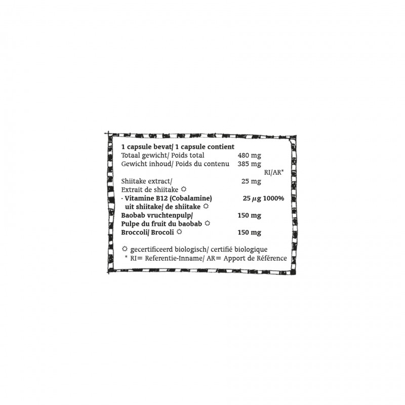 Ingrediënten: baobab vruchtenpulp* (Adansonia digitata), broccoli* (Brassica oleracea var. italica), capsule/verdikkingsmiddel: hydroxypropylmethylcellulose, verdikkingsmiddel: arabische gom*, shiitake extract* (Lentinula edodes).